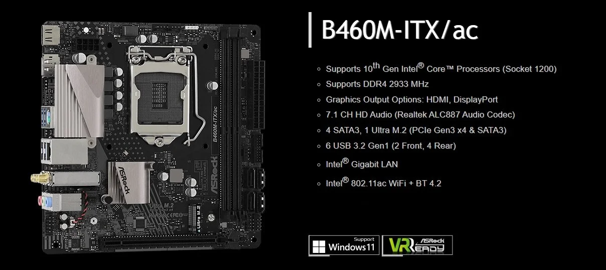 ASRock B460M-ITX/ac Motherboard LGA 1200 Support i9-10900KF i7-10700F i5-10500 i3-10305 CPU 2xDDR4 2933 MHz HDMI M.2 NVME PCIe 3.0 Mini-ITX