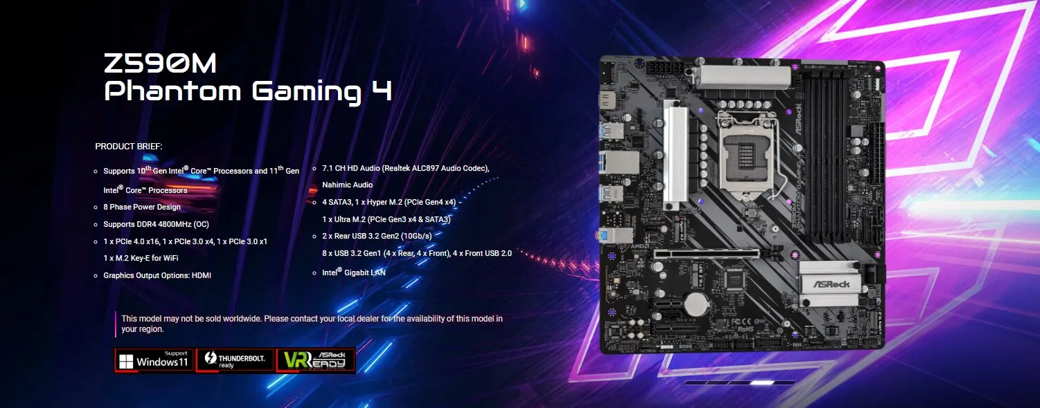 ASRock Z590M Phantom Gaming 4 Motherboard Supports i9-11900KF i7-11700K i5-11600 CPU LGA 1200 128GB 4xDDR4 4800MHz+ (OC) NVME M.2 PCIe 4.0